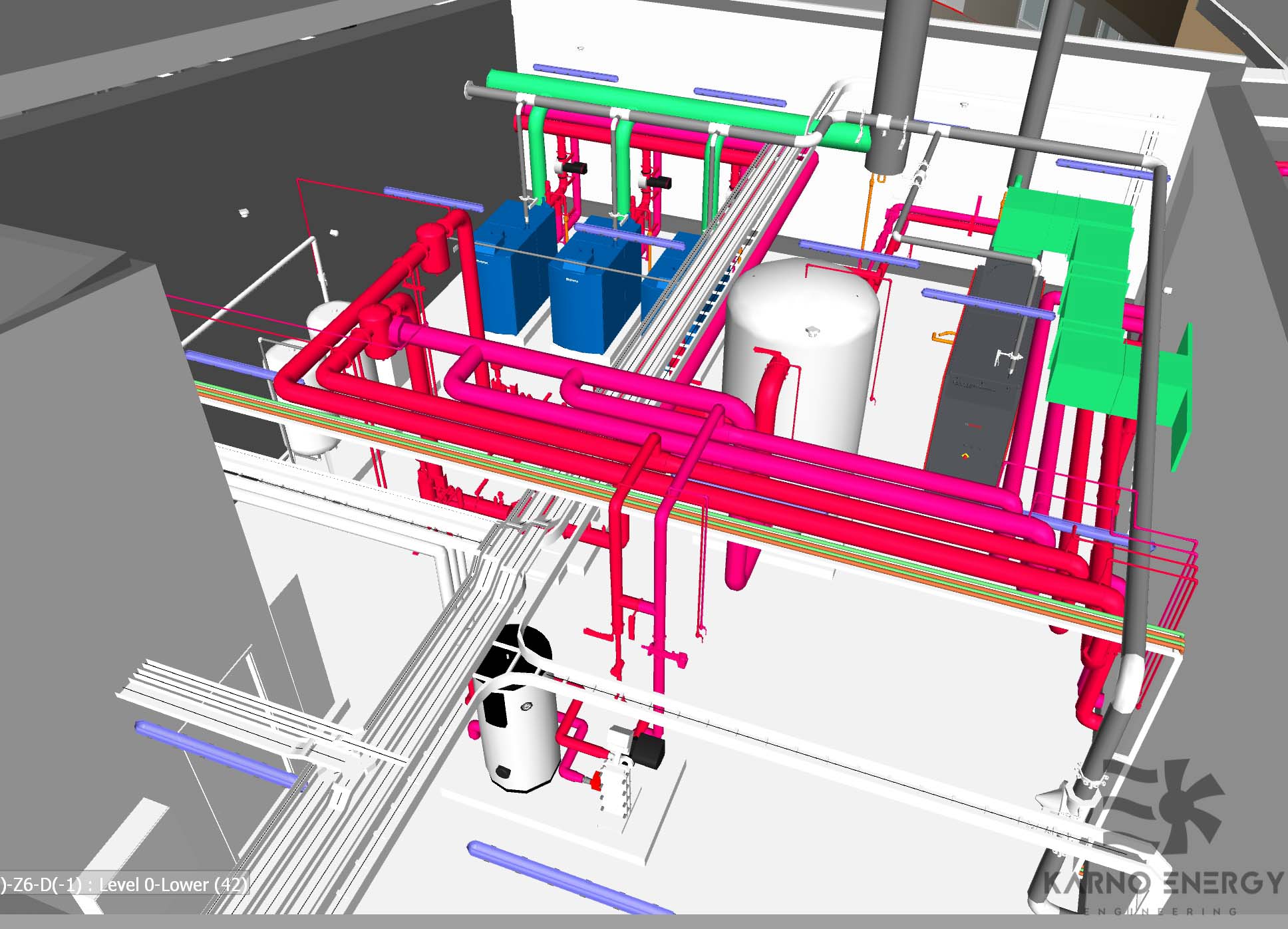 Karno Energy team modeled mechanical, public health, and electrical systems to LOD 400, coordinated systems between each other and other traders.